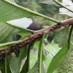- Small green caterpillar blending in with the leaves and her 10 – 15 brown baby caterpillars all lined up along the branch